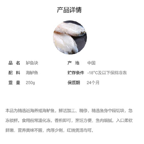本品为精选近海养殖海鲈鱼,鲜活加工、精修,精选鱼身中段切块,急冻锁鲜。食用前常温化冻,香煎即可,烹饪方便,鱼肉细腻,入口柔软鲜嫩,营养美味不腥,肉厚少刺,红烧煲汤均可。