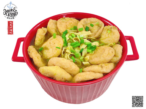 广东传统名肴,软滑可口似豆腐,取名鱼腐。 精选鲮鱼肉去骨去皮,手打起胶,后加生粉、蛋黄、水搅拌,塑成球状再经油炸制成。 本品内容物含鱼腐包、调味酱包、调味油包、酸菜包。 油炸鱼腐,吸饱汤汁,搭配酸菜和油辣椒,酸香扑鼻,超级爽口。常用于火锅或搭配汤粉面一起食用。